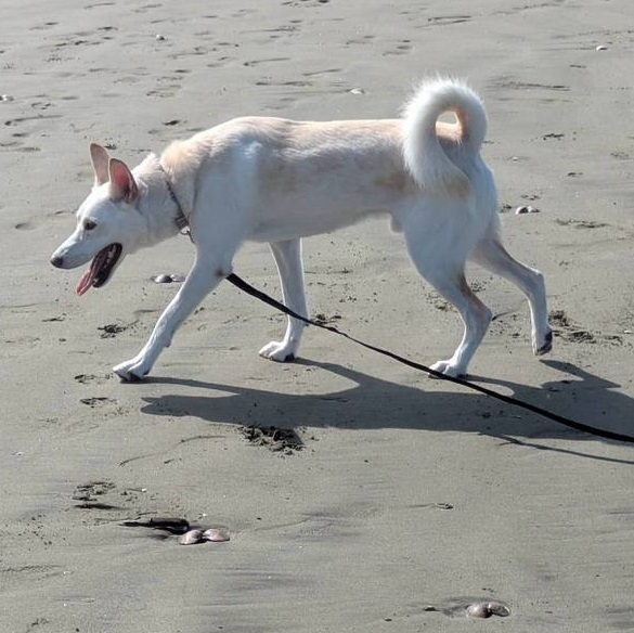 お散歩は好きですが、引っ張りが強く、特に犬・猫・鳥などを見つけると興奮するため、上手に歩けるように練習中です。